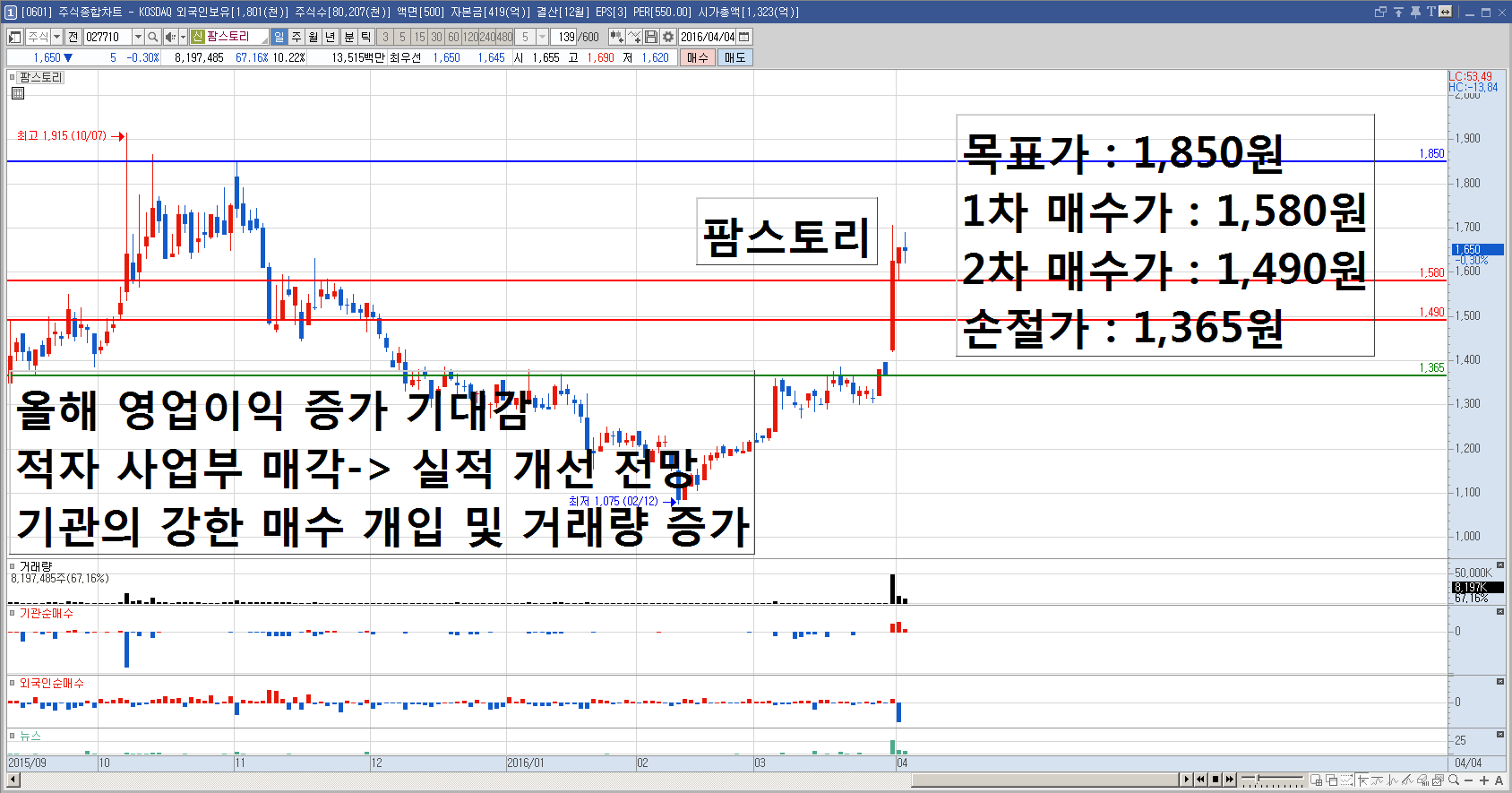 팜스토리는 적자 사업부 매각으로 올해 실적이 개선될 것이라는 전망으로 급등을 했습니다.