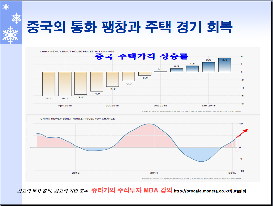 주택시장 위축에 따른 경기 위축을 경험한 중국은 적극적으로 금리와 지급중비율은 낮추고 시중에 통화 공급을 늘려 경기 부양을 위한 통화정책을 계속해 온 결과 점차 주태 가격 상승과 건설 경기 회복 반전 및 제조업 경기 회복이 시작되고 있다.