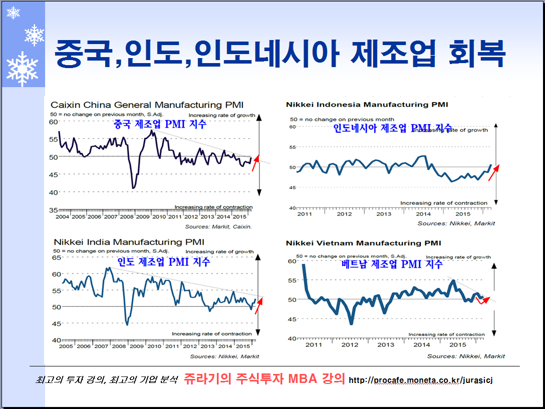 이 뿐 아니라 14억 인구를 갖는 중국에 이어, 12억의 인도와 2억 5000만의 인도네시아 역시 제조업 경기가 빠르게 회복되고 있다. 물론 이 이면에는 주택과 건설 경기 회복이 있다.