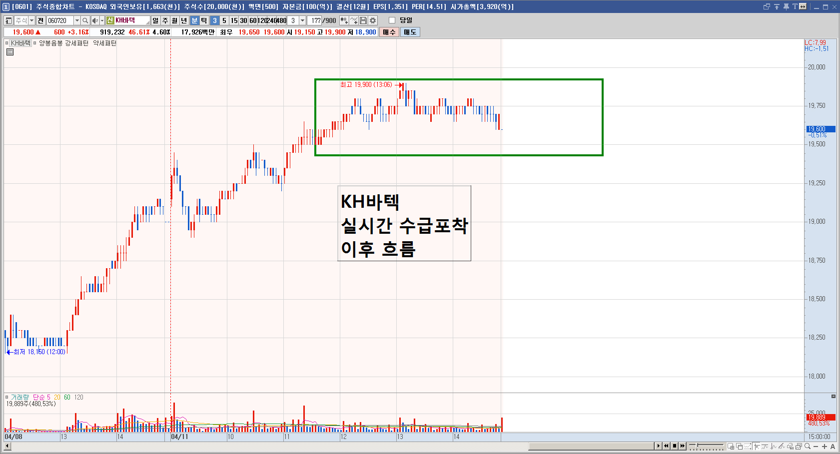 지난주 목요일 이 박스권을 돌파한 후에 4월 8일 거래량 감소와 함께