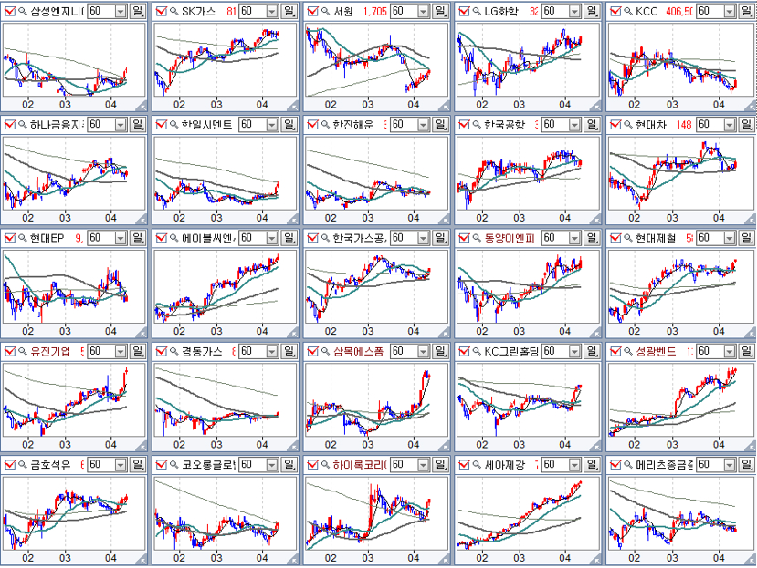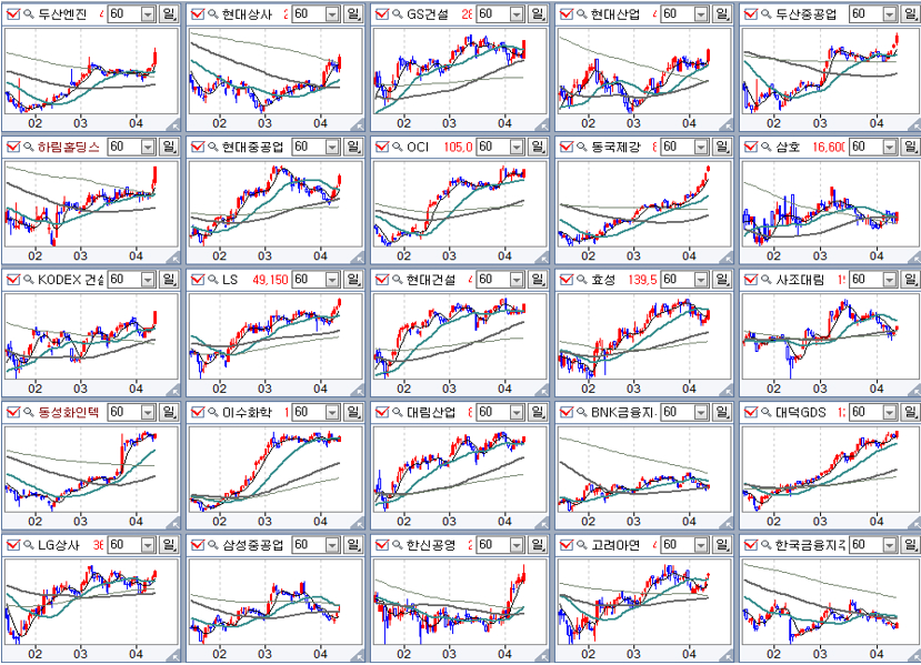 1분기 상승의 스타트를 끊었던 건설주가 강한 상승으로 2분기 상승을 주도하고 있고, 무역과 조선 등 분기봉 시가 3선 이격 조정을 거친 기업들의 움직임이 활발하다.