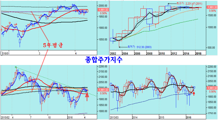 5年 평균을 돌파함으로써 대세 상승의 조건을 갖춘 종합주가지수는 한 달여에 걸쳐 5년 평균선을 지지로 매물을 소화하며 힘을 비축한 후 다시 상승이다. 이 상승은 적어도 5년간 年俸 양봉을 이어가는 상승이 되기 쉽다.