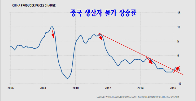 하락을 시작한지 5년 만이며 중국의 주택, 건설, 제조업 지표의 회복과 그 흐름을 같이하고 있다. 생산자 물가 지수란 기업의 상품 판매가격을 의미한다. 이것은 곧 화학제품과 철강 등 제품 판매가격이 오르는 것을 의미하니 이것이 곧 기업의 이익 증가이며 다른 말로 주가 상승이다.