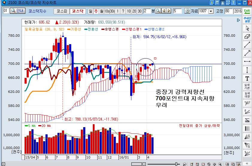 코스닥은 중장기 저항선 700포인트 에서 지속적 저항으로 음의 기운이 추가되고 있어 자칫