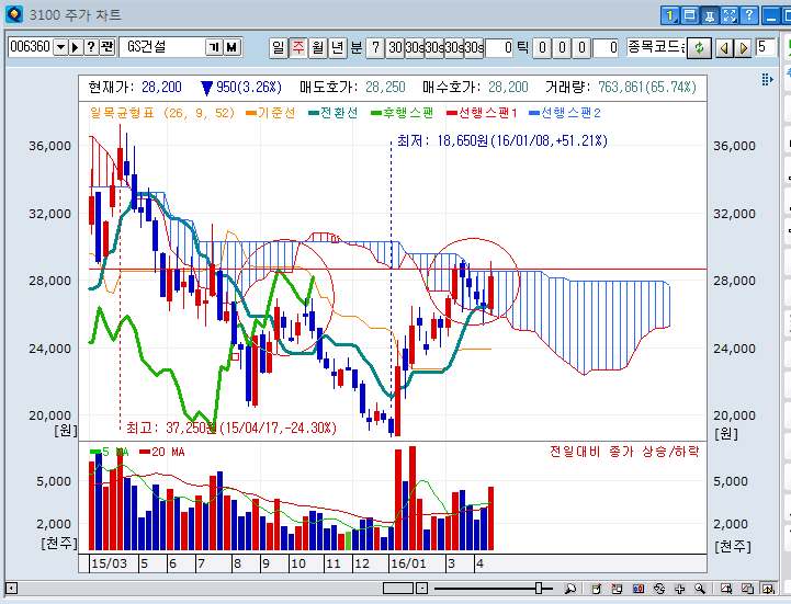 지난 2월 12일 이중바닥의 저점 기록후 별다른 조정없이 33일간의 상승추세 진행 과 더불어 단기