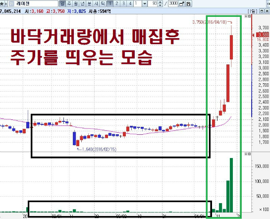 위 레이젠과 같은 주가의 변화는 단기든 중장기든간에 매집이 존재하기 때문에 가능하다. 물량의 매집은 주로 3가지 형태로 나타난다.
