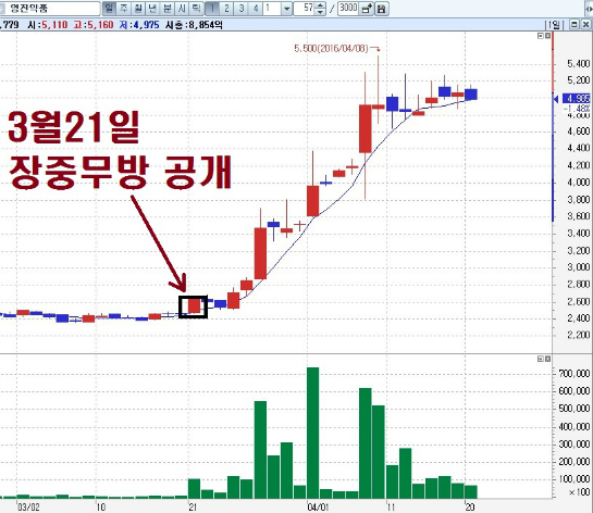 영진약품은 3월21일의 장중 공개방송에서 개발중인 신약에 대한 기술 수출 물밑 협상이 진행중이라는 점을 재료로 말씀드렸다. 여기에 기술적인 패턴의 양호함이 곁들여진 종목으로 말슴드렸다. 영진약품은 3월21일부터 이후 120%의 상승률을 기록했다.