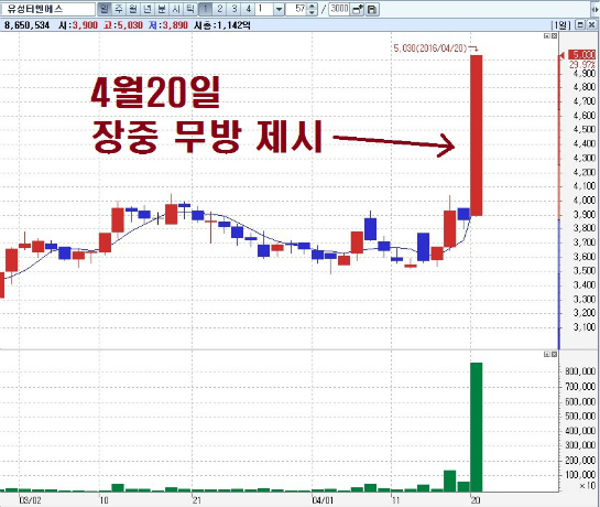 4월20일 장중 공개방송에서 제시했던 유성티엔에스는 상한가로 급등 마감되었다. 유성티엔에스는 정치테마주 명분으로 엔피케이, 바른손 등과 함께 급등 흐름이 출현되었다.
