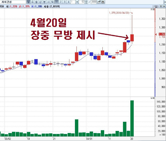 4월20일 장중 공개방송에서 장초반 서희건설도 1%대 위치에서 매수 제시했다. 이후 서희건설 주가는 13%대까지 상승했었다. 서희건설은 1295원을 한번은 넘겨야 하는 기술적 패턴과 함께 유성티엔에스의 계열사라는 명분이 있었다. 유성티엔에스가 상한가로 급등하자 서희건설도 계열사로서 동반 급등시도가 나타난 것이다.