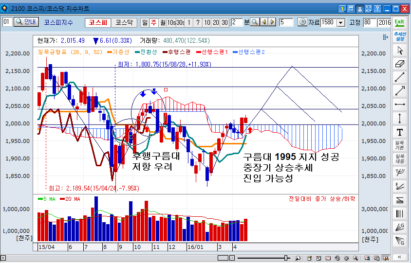 코스피지수는 일주일 내내 좁은 밖스권 등락을 거듭하며 방향성 모색을 위한 숨고르기 장세가 지속 되었습니다. 지난주 확보했던 중장기 중요 포인트 1,995 포인트 지지에 성공 했고 주봉상 양봉 마감한 상황이라서 중장기 상승추세의 진입 가능성을 높인 상황 이라서 N형 추가상승패턴 으로 이어질 가능성이 높아졌다 할 수 있겠지만 후행스팬의 중요저항선 의 저항이 예정되어 있고 이에대한 검증이 필요한 상황 이라는점 및 직전고점대의 추가적 부담감이 추가상승을 가로막고 있고 수년간 지속되어온 2000선 위에서 기관의 매물공세를 감안 한다면 조정장세의 진입도 간과 할 수 만은 없겠습니다.