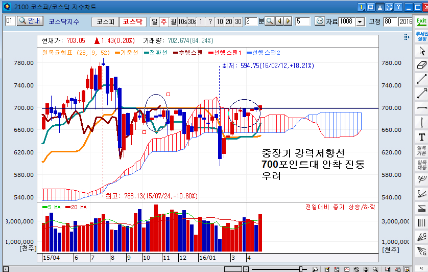 지난주 코스닥 지수가 700선 돌파에 성공했죠. 주봉 구름대 돌파후 진통의 끝에 돌파에 성공한 상황이라서 안착 가능성도 높아진 상황입니다. 관심 유망종목중 지스마트 글로벌이 주간 상승률 14%대 톱텍 15%대 상승 및 여타 종목도 대부분 상승 마감한 상황 입니다. 700선 안착에 성공시 상승시세의 여타 종목 으로의 확산이 예상 되는바 이에 관심을 가져야 겠고 코스닥 비중 확대 전략도 고려야하 하겠습니다. 다음주 서울반도체, 다우데이타,수성,에너토크,에버다임 등 신규발굴 코스닥 유망주에 관심 바랍니다.