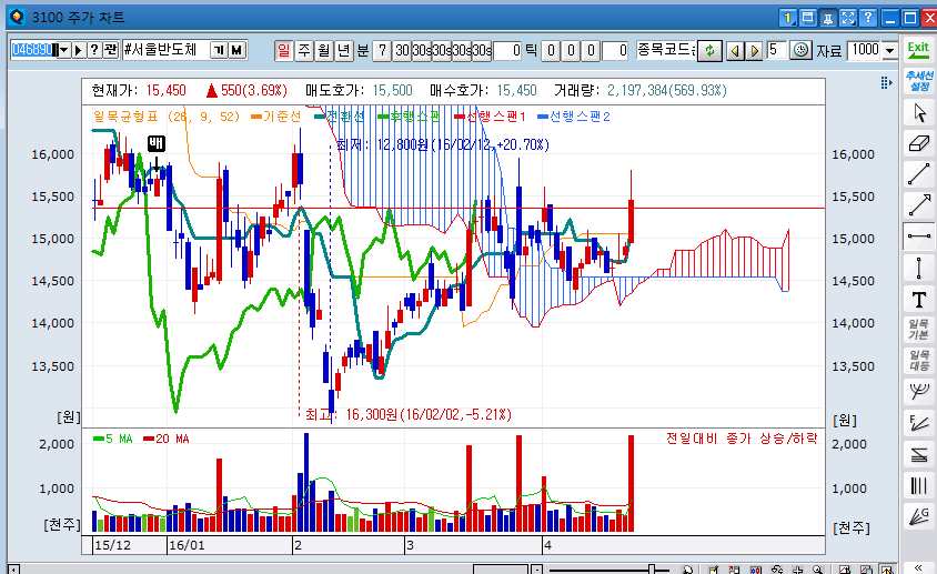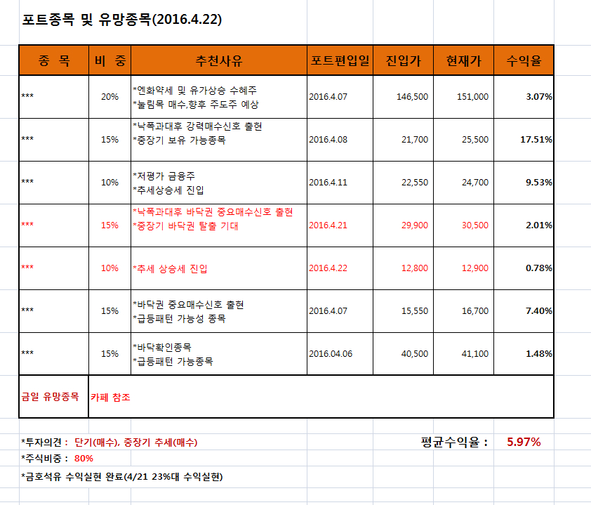 한주 내내 숨고르기 장세 속에서도 금융주가 크게 시세를 준 한주가 되었습니다. 증권업종이 4%대 은행업종이 6%대의 급상승세를 보인 한주 였네요. 특히 저가은행주 우리은행이 한주간 9%대 가까운 상승세를 보였죠. 지난주 교차점 부근의 눌림목 조정후 불순동 5양련의 매수신호가 출현하여 매수 유망종목으로 말씀드렸는데 결국 제대로 된 시세를 분출하며 급상승세에 성공 했습니다. 역시 실전일목의 종목발굴의 효과를 실감케 하네요. 2주전 실전일목에 의해 발굴되었고 포트종목에 편입하였던 금호석유 2주간 23% 수익실현 정리 했고 신규 발굴종목을 편입한 상황입니다. 여타 포트종목도 수익중이고 다음주 추가수익을 기대해 봐야 겠네요.