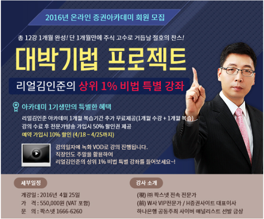 17년 증권방송을 진행하면서 처음으로 별도 교육 아카데미를 출범하는 것이다. 그런만큼 4월 25일(월) 오픈전 가입하시는분들께는 10% 가격할인과 함께 추가로 1개월 무료 기간을 제공한다. 또한 리얼 아카데미 1기 회원으로 참여하셨던 분들은 이후 리얼김인준클럽 정회원으로 가입시 1개월 50% 할인의 파격적인 조건을 드린다.