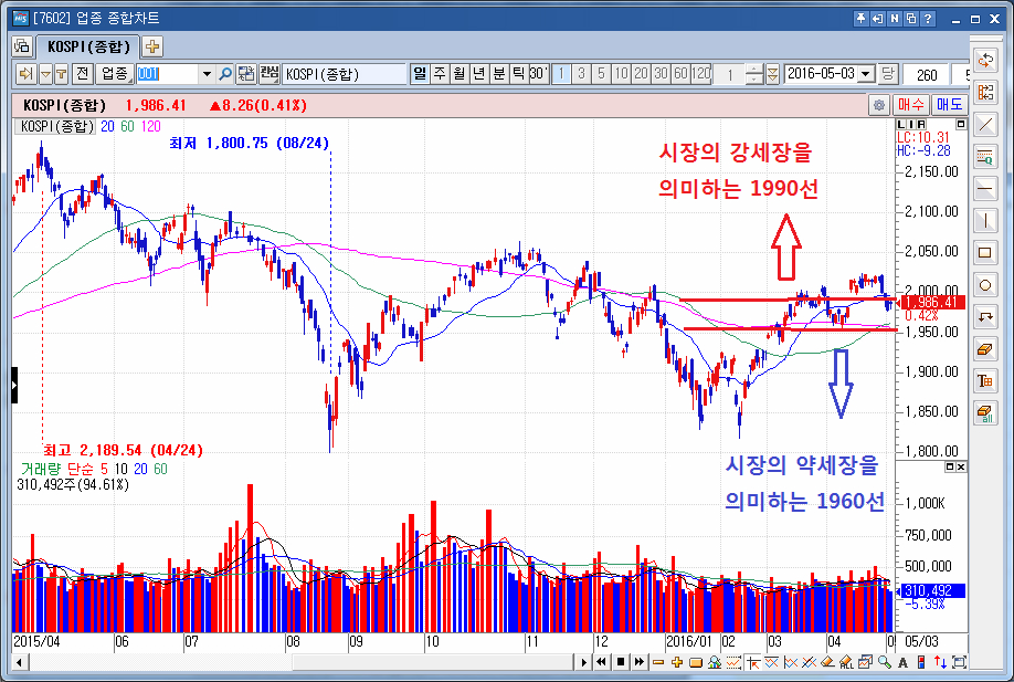 시장은 20일 이평선과 60일&120일 이평선 사이에서 놓여있으며 어디로 튈지 모르는 공처럼 혼란스러운 상황입니다. 현재 이것은 강세장도 약세장도 아닙니다. 1990선 이상으로 튀어오르면, 강세장이라 불릴것이요, 1960선 밑으로 떨어지면 약세장으로 불릴 것입니다. 그 사이에서 맴돌며 1990을 넘어섰다가 다시 1960을 하방 돌파 하는 상황이 반복되면 비추세장, 횡보장이므로 이럴 경우 신중하게 생각하고 주식비중을 늘리지도 말고, 너무 줄이지도 않는 것이 좋겠습니다.