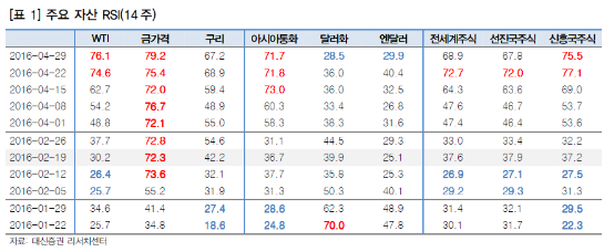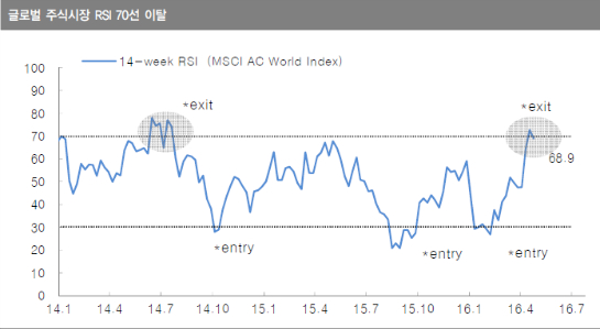 반면에 글로벌 주식시장이 단기 과매수선을 이탈하면서 지난 3개월간의 주식시장 반등이 정점을 지나고 있다는