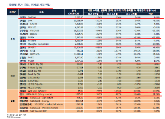 4월 미국 FOMC 금리동결 이후 6월 인상 가능성도 희박하다는 낙관론에 근거하여