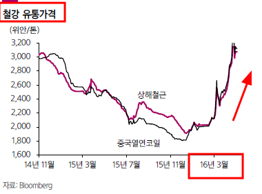 상해철근과 중국열연코일 등 가격상승으로 연일 신고가돌파중인 중국의 철강주(차트참조)