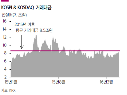 코스피와 코스닥 거래대금이 5일 평균 8조5천억원 기준선을 돌파하지 못하고