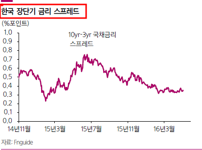 감소하는 추세에 있으며, 3년물과 10년물 국채 금리 스프레드도 바닥까지 하락 횡보하고 있다.