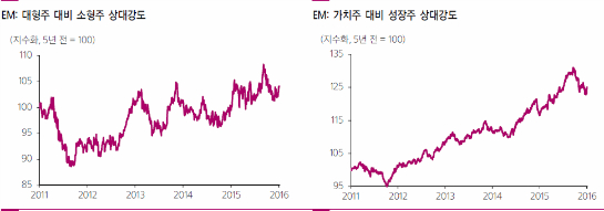 모습을 보인 것과는 대조적으로 성장주와 중소형주의 순환적 강세가 나타나고 있다