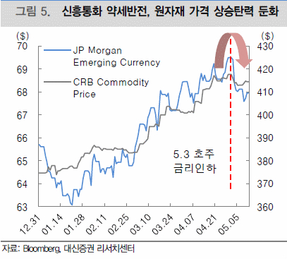 미국 경기지표 둔화와 달러 강세 반전, 원자재 상품 가격 약세 등이 나타나고
