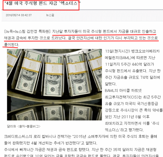 두번째 기사는 미국 펀드에서 자금이 이탈되면서 투자자들이 금과 채권 등 안전자산에 투자하고