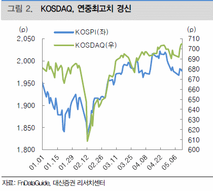 코스닥 지수는 연중 최고치를 기록하고 있으며