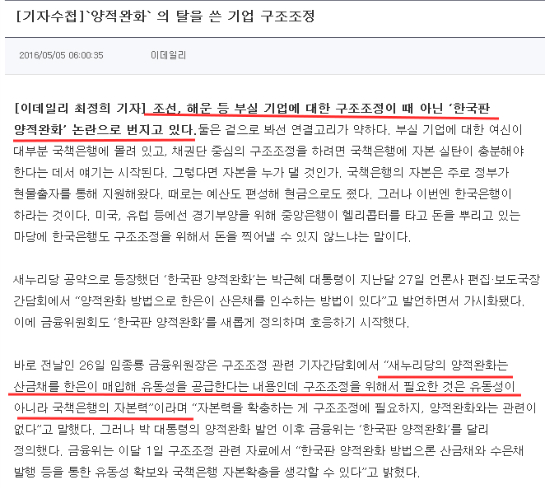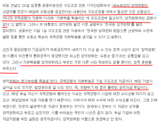 세번째는 소위 한국형 양적완화의 방향성에 대한 기사인데,,산금채를 매입하여 국책은행 자금 투입을 하는 것은