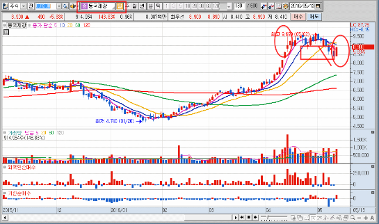-1차 강력한 급등 이후 거래량이 수반되지 않은 급락이 나오거나 갭하락이 나올 경우