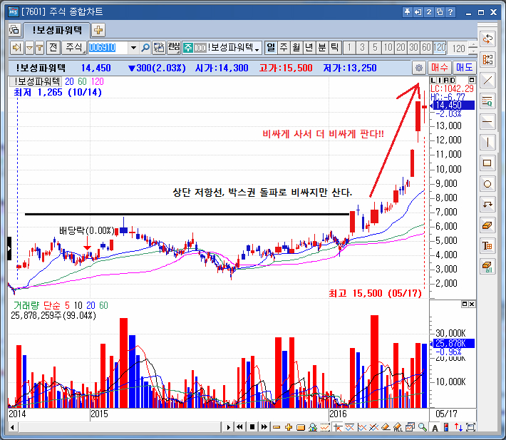 추세의 큰 틀이 상승으로 갈 때 무릎에서 들어가지 말고, 허리에서 들어가서 어깨에서 나오는게 단기투자입니다. 그렇기 때문에 이미 많이 급등해서 신고가를 이루고 있는 시점에서도 과감하게 들어갈수 있는 것이 단기투자의 핵심이라고 할 수 있겠습니다.