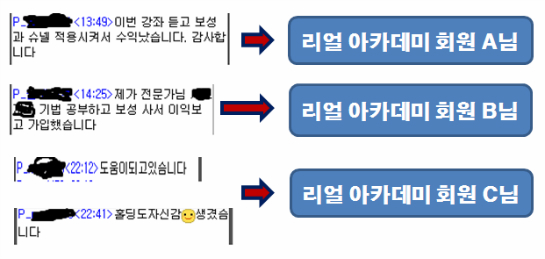 과연 "리얼 아카데미"에 참여한 분들이 필자의 기법 강좌 내용에 대해 만족할 수 있을까? 모든분들의 반응을 알지는 못하지만 필자는 자신한다. 참여하신분들이 만족하실 것으로, 1개월 "리얼 아카데미" 회비가 절대로 아깝다는 생각을 하지 않을 것으로 확신한다.