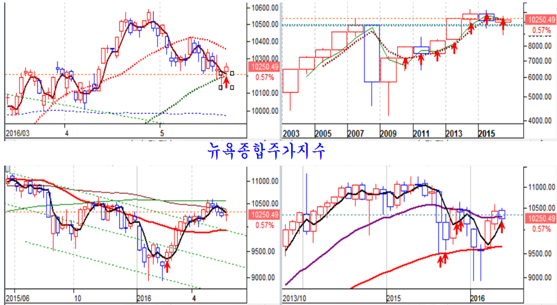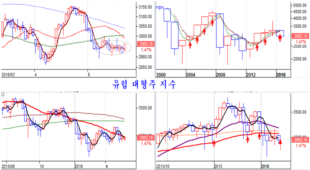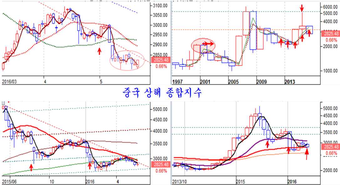 뉴욕시장은 조정과 함께 월봉 시가3선 이격 조정을 마무리하였고, 중국과 유럽 증시는 월봉 120월의 10년 평균에 지지가 형성되어 있다. 보통 10년 평균 주가는 장기 변동의 강력한 지지가 되며 이후 상승으로 전환되는 중요한 전환점이 된다.
