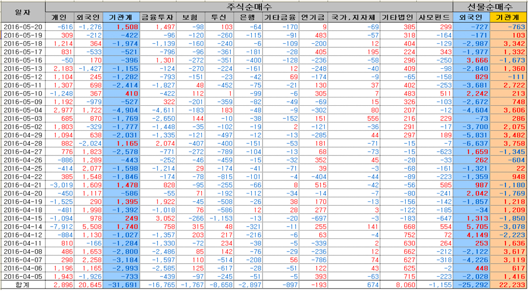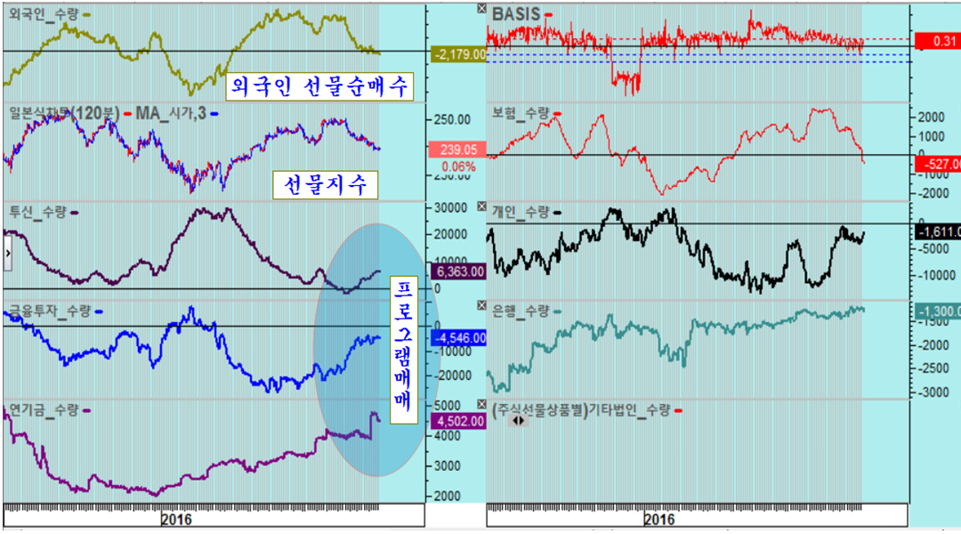 이처럼 기관은 자기 거래 없이 프로그램 거래를 주력으로 하므로 외국인은 기관의 거래를 이용하여 올리고 주가를 싶으면 선물을 사고, 내리고 싶으면 선물을 팔아 원하는 대로 주가를 그릴 수 있다. 이런 시장의 변화 원리를 이해한다면 주가 상승 하락을 설명하는 악재나 호재를 주목할 필요가 없으며, 외국인 마음 대로 움직이는 지수이니 만큼 단기 변동을 무시하고 기준을 정해 저가 변동을 줄 때 매수하는 전략으로 갈 필요가 있다.
