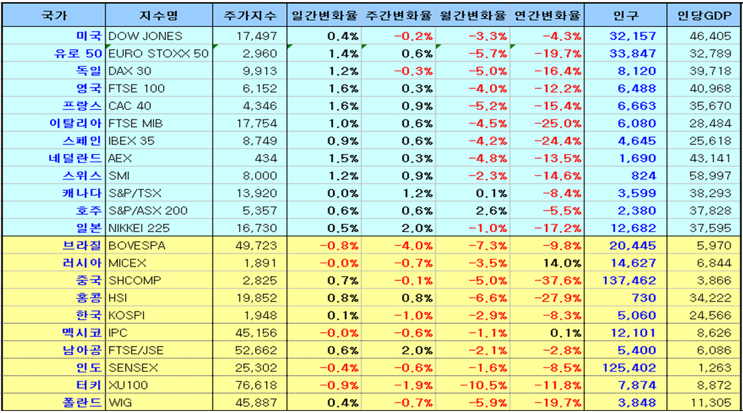 주요국의 주가지수 변화를 보면 5월 미국은 3.3%의 완만한 조정을 거쳤으나 유럽증시는 5%대의 조정을 보였고, 중국, 홍콩, 브라질 증시가 비교적 큰 조정을 거쳤다.