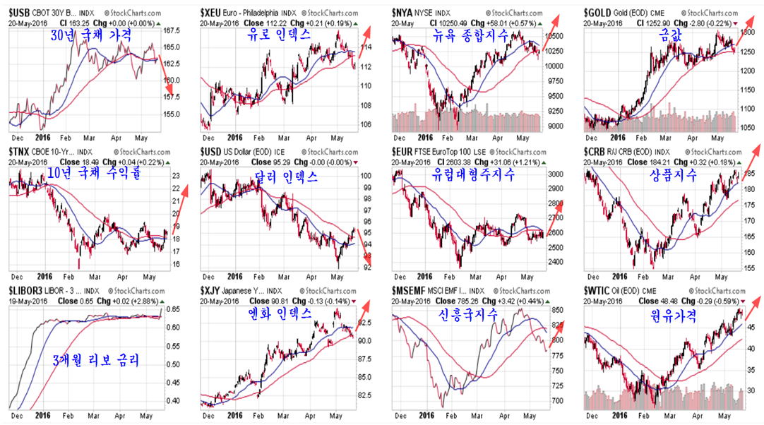 5월 주가가 조정을 거치는 동안 국채 가격 상승과 달러 강세가 이어졌지만, 지난주를 기점으로 채권이 하락 전환의 징후가 보이고 있고, 오르던 달러 환율 역시 하락 반전의 위치에 있다.