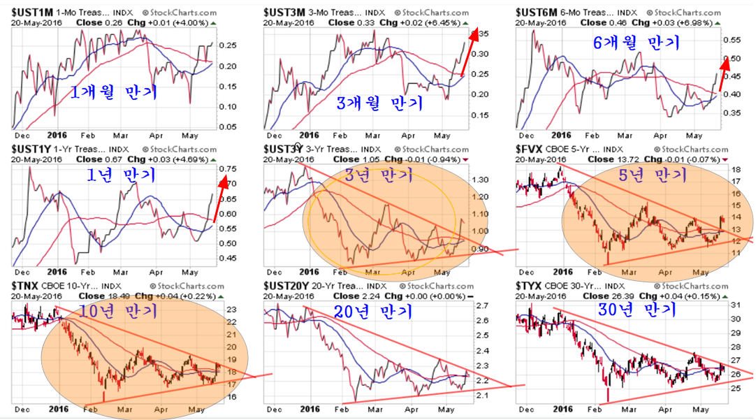지난 주 중요한 금융시장의 변화 중 하나는 국채 수익률의 상승이다. 수요일 미국 시장에서는 단기채권과 장기채권 모두 수익률이 급등한 가운데, 특히 2년, 3년, 5년, 10년 물을 중심으로 3중 바닥을 만들며 쐐기형으로 수렴하던 국채 수익률이 저항을 돌파하며 출발 신호를 나타냈다.