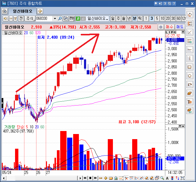 일신바이오의 차트를 보시겠습니다. 오늘 일신바이오는 장중 16%까지 올라주면서, 크게 상승하는 놀라운 모습을 보였습니다. 제가 추천한 우리 정회원님들의 보유주이죠. 그동안 많이 하락하다가 상승해주면서, 이제 상승추세로 올라서려는 분위기입니다. 이제야 올라서기 시작한 만큼 더 큰 상승을 기대해 볼수 있겠습니다.