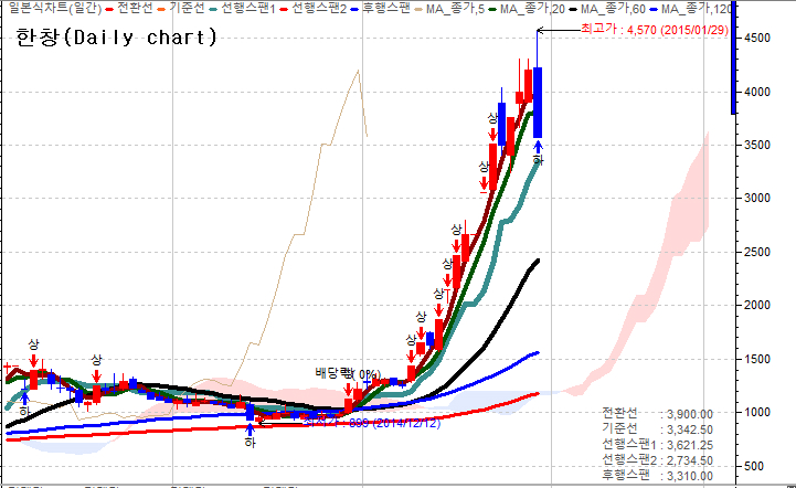 한창의 경우에 필자가 추천후 단기 수직급등으로 무려 320%의 급등 대시세를 기록한바 있는데