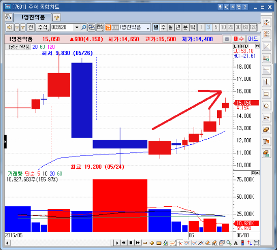 급등주 발굴의 대가, 송범선대표입니다! 반갑습니다! 다음주 FOMC회의로 미국 금리인상 될것인지가 결정납니다. 우리는 인하했는데 미국은 어떨지~~ 현재 상태로는 미국 금리인상 가능성은 낮아졌지만 반대로 경기침체에 대한 우려도 무시못하죠. 영국의 EU 탈퇴 가능성도 시장 교란요인입니다. 중국 주식의 모건스탠리캐피탈인터내셔널(MSCI) 신흥시장(EM) 지수 편입 여부는 국내 증시 수급에 불안요인으로 꼽히고 있구요. 오늘은 외국인들의 순매도세가 나왔습니다. 크지는 않지만, 요즘 잘 사주던 외국인들이 팔기 시작하는 시점이 아닌가 조금 걱정되죠. 코스피가 많이 올라서 차익실현 매물이 나온데다 전일 한국은행의 갑작스런 기준금리 인하로 시장을 좀 더 점검하고자 하는 경계심리가 강화된 것이라 볼수 있습니다. 현재 한국은행이 1년만에 기준금리를 인하하면서 건설주가 주목을 받고 있습니다. 기준금리가 내리면 대출금리도 낮아져 부동산 경기에 긍정적인 영향이 미칠 것이라는 기대감이 커지면서 매수세가 흘러들고 있는 것으로 분석된다. 건설사들은 보통 다른 업종에 비해 부채비율이 높은 것이 사실입니다. 제가 예전에도 말씀 드렸던 건설주 중에서 가장 저평가되고 안정적인 재무비율을 보이는 현대건설의 부채비율 역시 100%를 넘어가는 데서 보면, 건설주들의 부채비율은 평균적으로 다른 업종에 비해 대단히 높다는 것을 알수 있습니다. 그런데 빚을 지면 어떻게 됩니까. 당연히 이자를 갚아야지요. 이자를 갚는데 금리가 높으면 이자를 갚기 힘듭니다. 어제 있었던 한국은행 금리인하는 건설주들의 하락하는 흐름을 뒤집어 엎어놓을 좋은 계기가 되지 않았나 생각됩니다. 현대건설을 보겠습니다. 부채비율이 많다는 점을 제외하면 중장기적으로 봤을 때 최고의 주식입니다. 브랜드네임까지 포함해서 아주 좋은 주식이라고 할 수 있겠습니다. 예전에 말씀드린 이란 수주 건까지 하면 호재성도 갖추었습니다. 하지만 주가가 엄청 떨어져있습니다. 조만간 반등 포인트를 찾아내길 기대해봅니다. 예전에 5월 27일에 제약주 반등의 변곡점이란 글을 투자전략에 쓰면서 영진약품을 추천한 바가 있죠. 5월 30일 무료방송에서도 급등예상 가능주로 영진약품을 추천했습니다. 위의 링크를 클릭해서 보시면 그때 제가 쓴 글을 보실수 있습니다. 제 말대로 영진약품은 급등을 했습니다. 그리고 팔았죠. +24.17% 문자 기록입니다. 급등은 계속된다!!! 다음 급등주는 어떤 종목이 우리를 다리고 있을까요... 지금 매집 중입니다. 함께 하시죠!