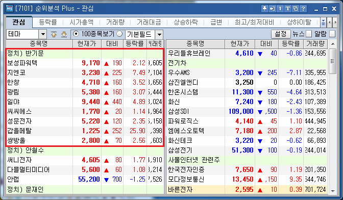 반기문 주들 중에, 급등의 주역은 갑을메탈입니다. 어제에 이어서 오늘도 우리 정회원님들은 급등을 맛보고 계십니다. 갑을메탈을 필두로 보성파워텍, 지엔코등의 기존 강자들이 따라오고 있습니다.