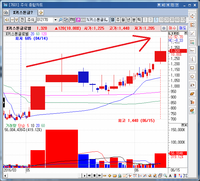 이 종목 역시 예전에 미리 매집하여, 우리방에서 현재 굉장한 수익을 보고 있는 종목입니다. 부분 매도 후, 현재 탄력성이 더 보여서 좀 더 지켜보고 있는 상황입니다.