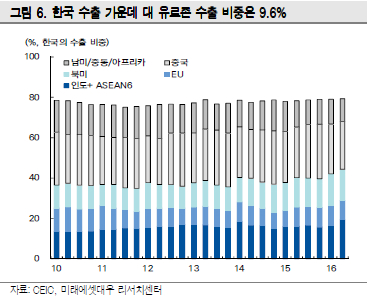 브렉시트 시나리오를 가정하면 유로존 수출비중이 9.6%인 한국 수출은 1%p 추가로 감소하고