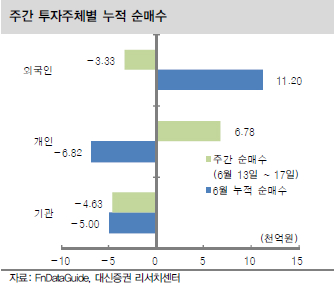 6월 월간 누적 순매도 우위인 상태이고 글로벌 불확실성 확대에 따른 매수는 제한적일 것으로 예상되고 있다.