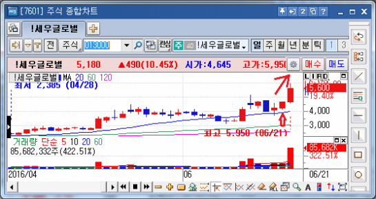 어제 송범선대표, 정회원 방송에서 매수 추천한 세우글로벌! 오늘 또 날아가줍니다!