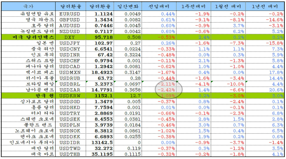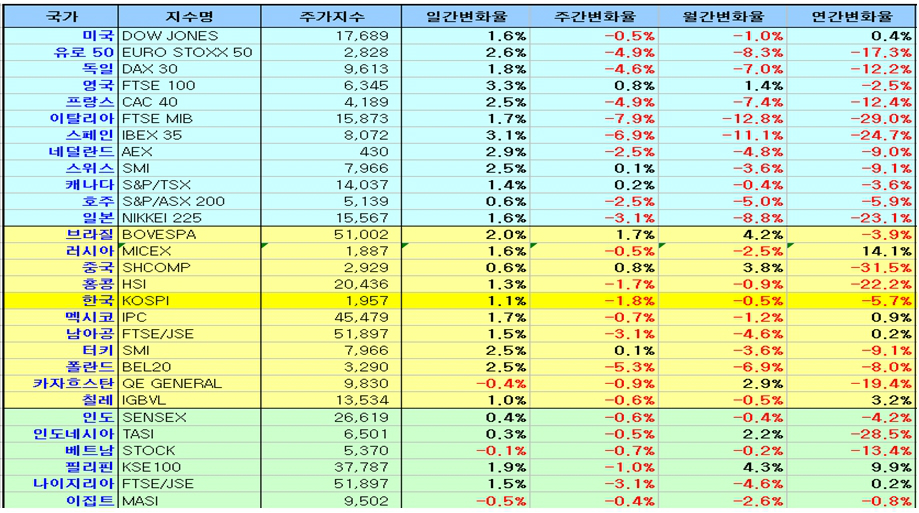 신흥국은 브라질, 터키, 폴란드가 2%대 급등을 하였고, 러시아, 홍콩, 한국, 멕시코, 남아공, 칠레는 1% 넘는 상승이 이어졌다.
