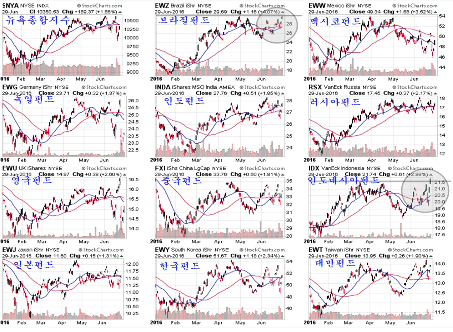 뉴욕시장에 상장된 각국의 인덱스 펀드는 환율하락과 주가 상승의 영향으로 대부분 크게 올랐다. 특히 브라질 인덱스 펀드 EWZ와 인도네시아 인덱스 펀드 IDX는 연중 신고가를 기록하며