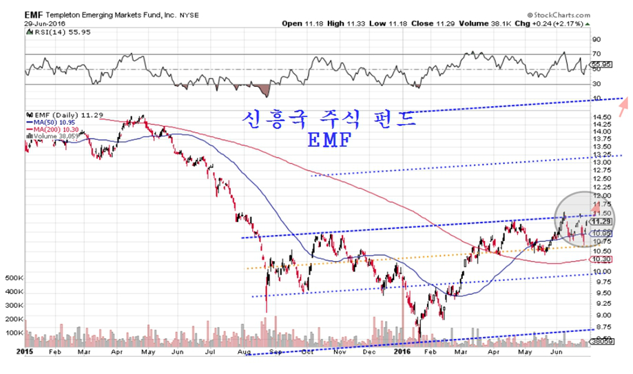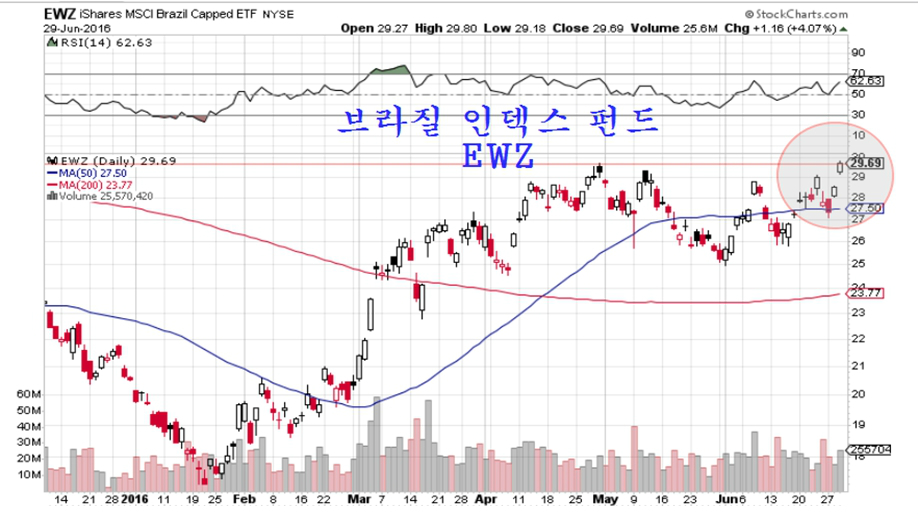 블랙록의 브라질 펀드 EWZ도 2%대 주가 상승과 2%대 환율 하락의 영향으로 4.07%가 오르며 3월 고점을 간발의 차이로 넘어서 2016년 신고가와 함께