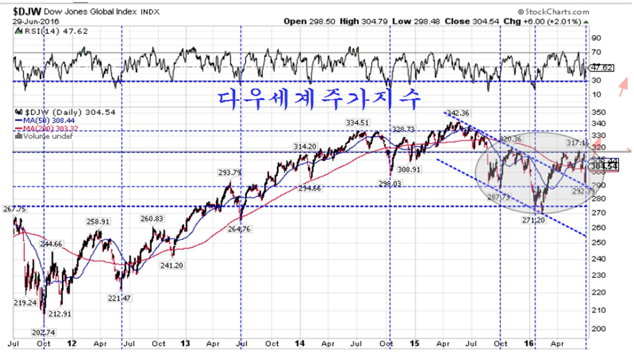 다우 세계 지수 $DJW는 예술적인 대칭형의 역 헤드앤쇼우더 패턴을 형성해가는 가운데 29일 2.01%가 올랐다. 누군가가 캔버스에 그림을 그리듯 주가 차트를 그려 나간다고 생각하면 시장에 투기적 승부를 건다는 것이 얼마나 무모한 일인지를 실감할 수 있다. 문제는 언제 네크라인을 돌파시켜 2015년 8월 이후 이어진 하락 국면을 벗어나는가이다.