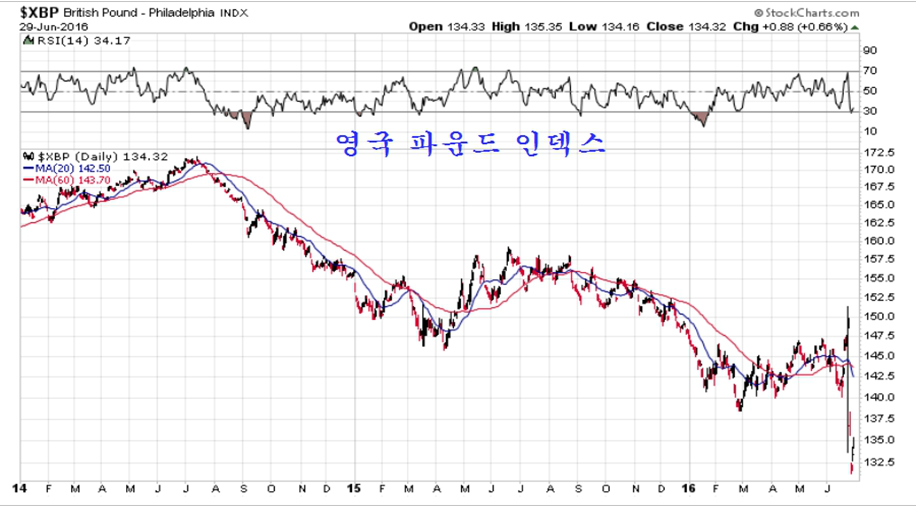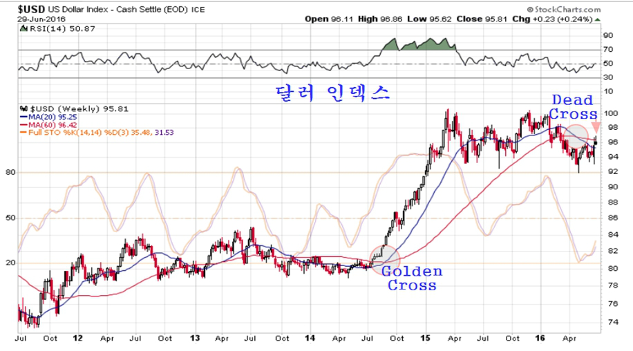 달러 인덱스는 주봉 20주 평균과 60주 평균이 데드크로스후 역배열 상태이며, 이번 브렉시크 변동으로 60주 평균에서 저항이 되어 하락 움직임이 나타나고 있다.