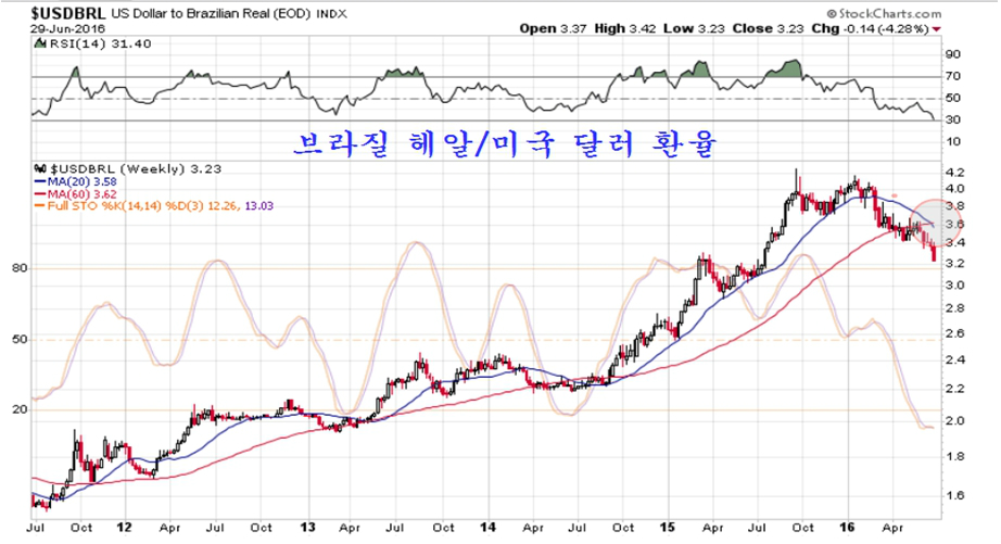 통화중 브라질 헤알화가 가장 빠르게 가치가 상승하고 있다. 브렉시트 변동이 있었던 이번주 들어서만 헤알화는 4.28% 환율이 하락하며 통화가치가 급등했고, 드디어 20주 평균이 60주 평균을 돌파해 내려오는 데드크로스가 발생했다. 브라질 채권에 투자한 투자자들은 환율 하락과 함께 수익이 빠르게 늘게 될 듯 하다.